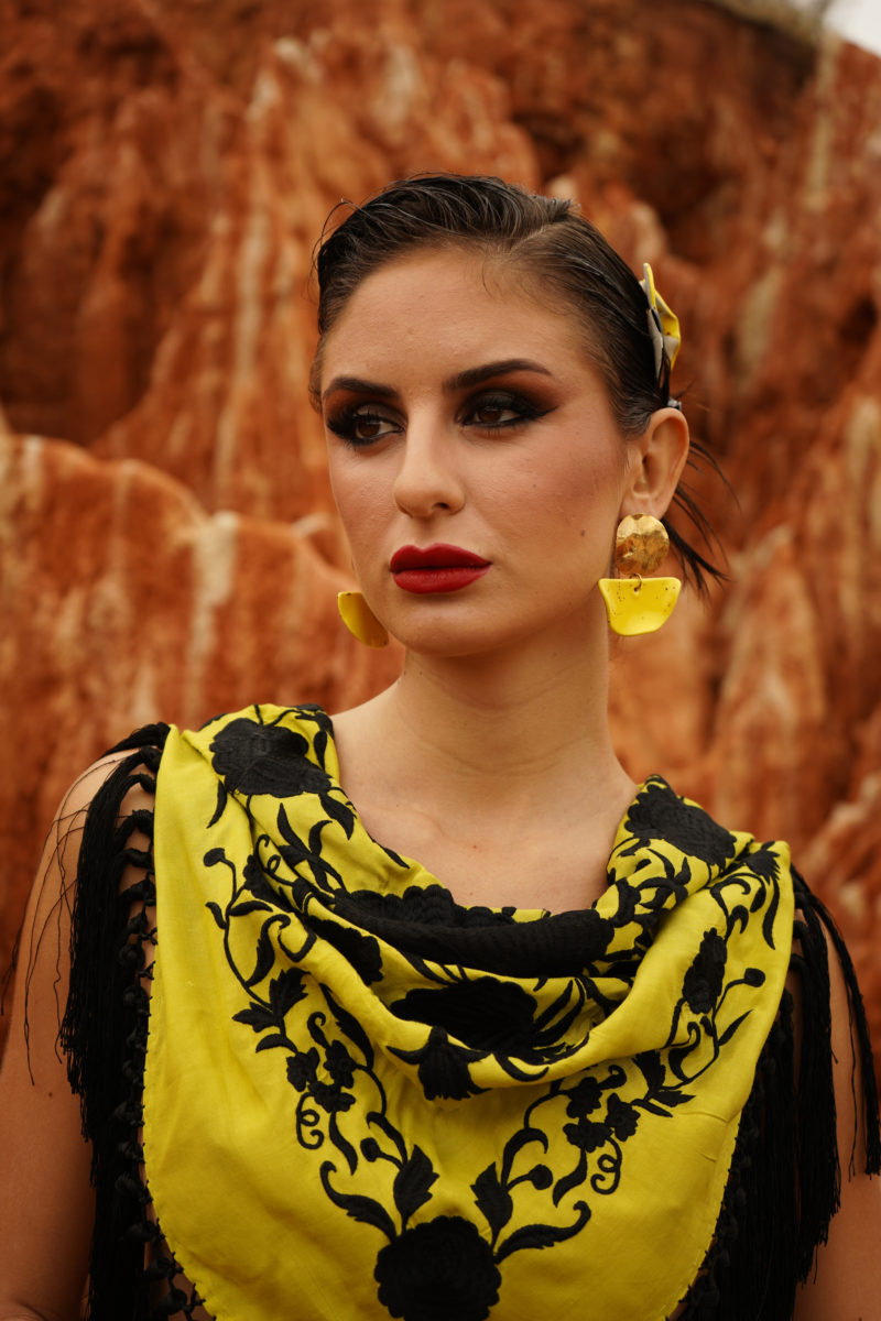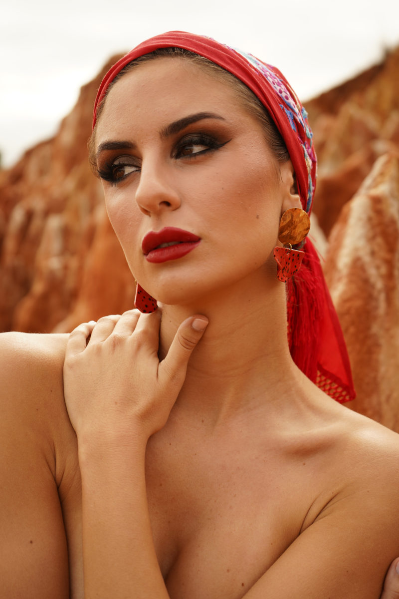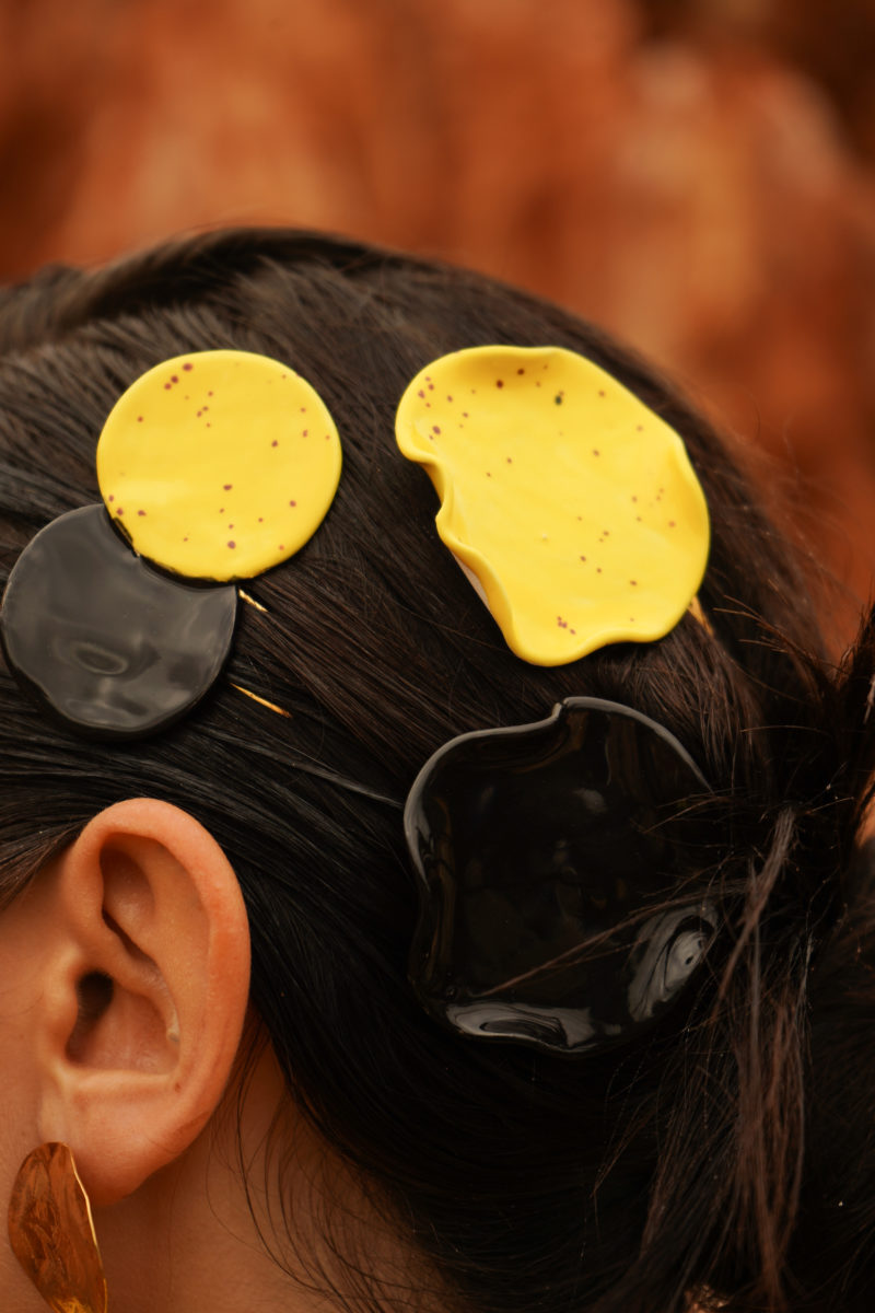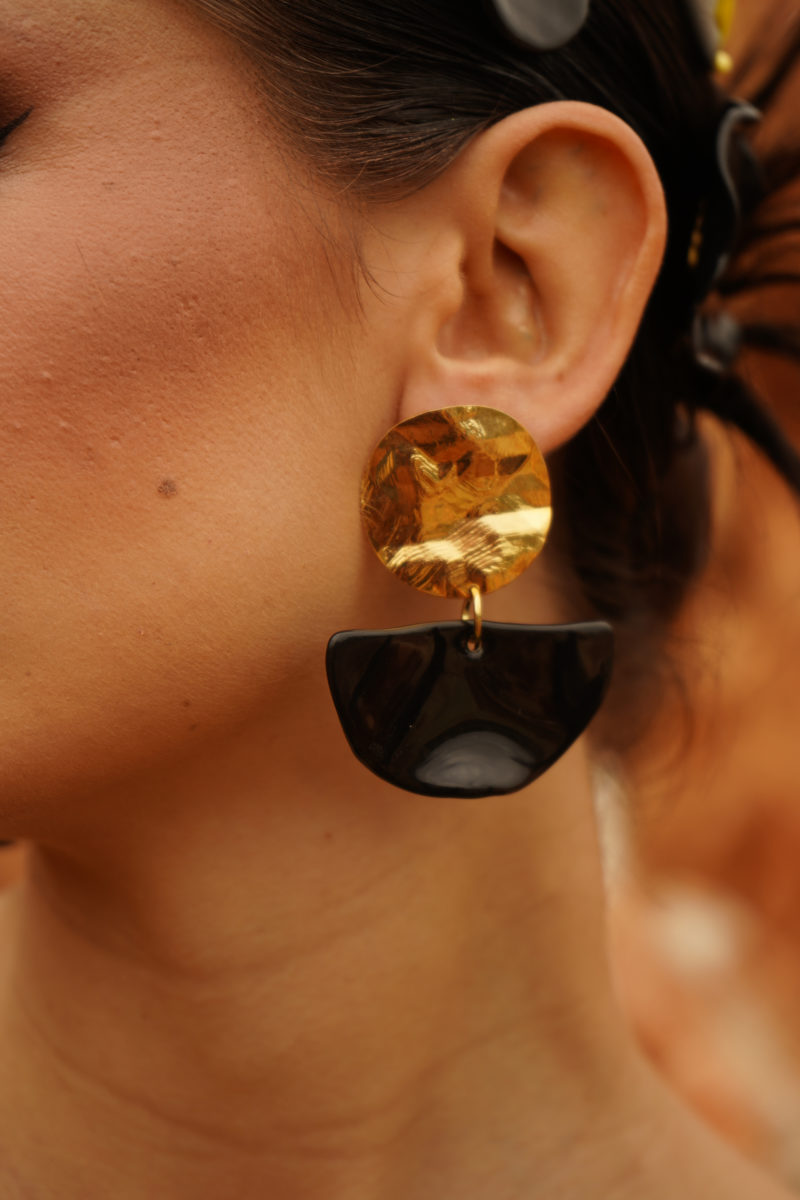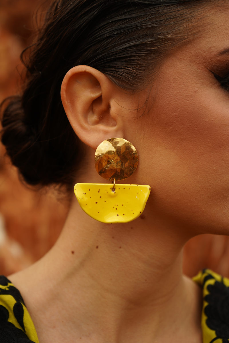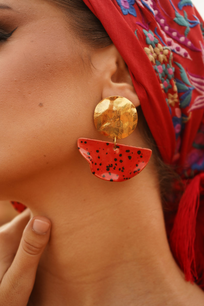 Pendiente con forma de media luna de cerámica esmaltada en alto brillo. Disponible en varios colores. Botón de metal hipoalergénico con detalles de relieve en oro brillo.
