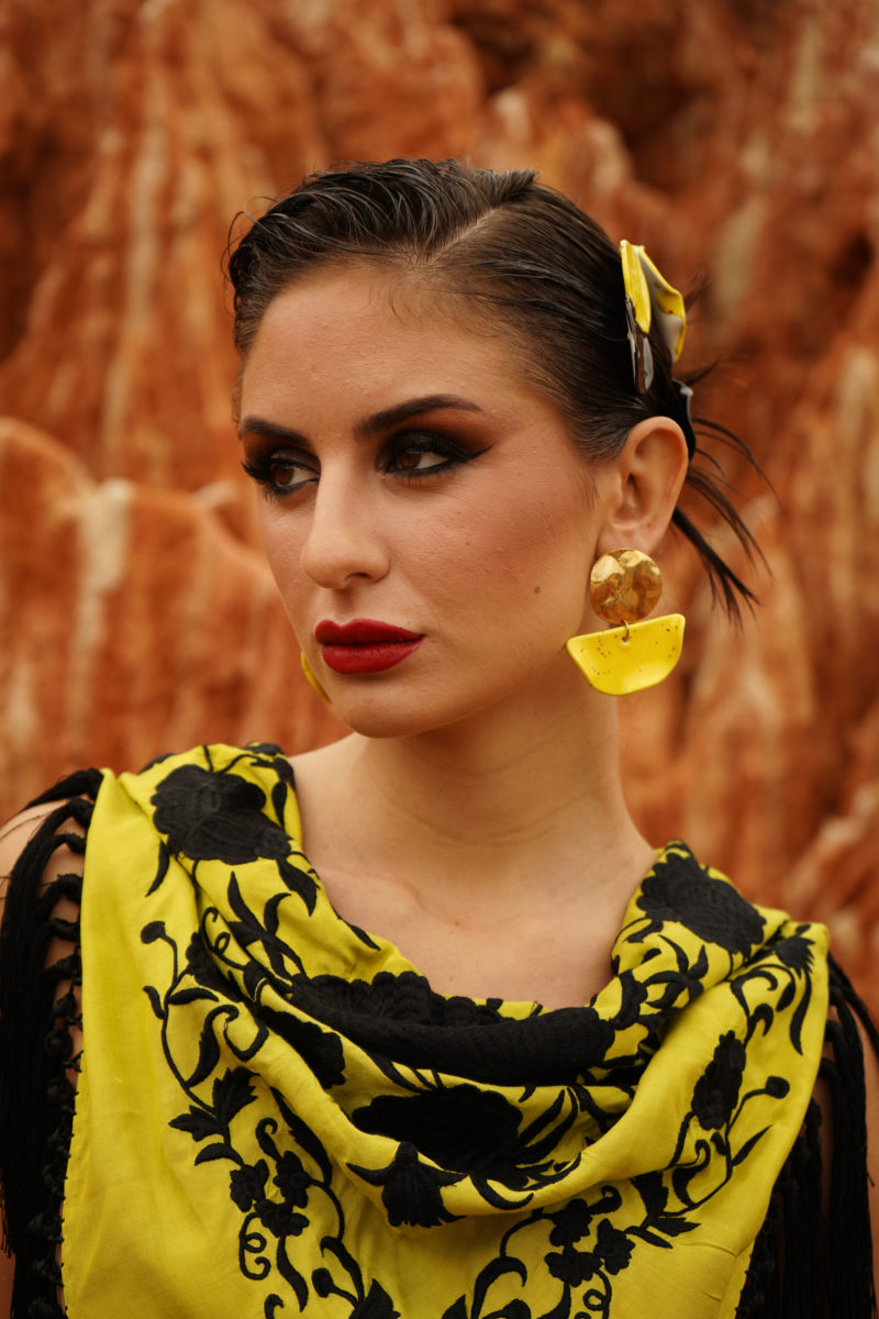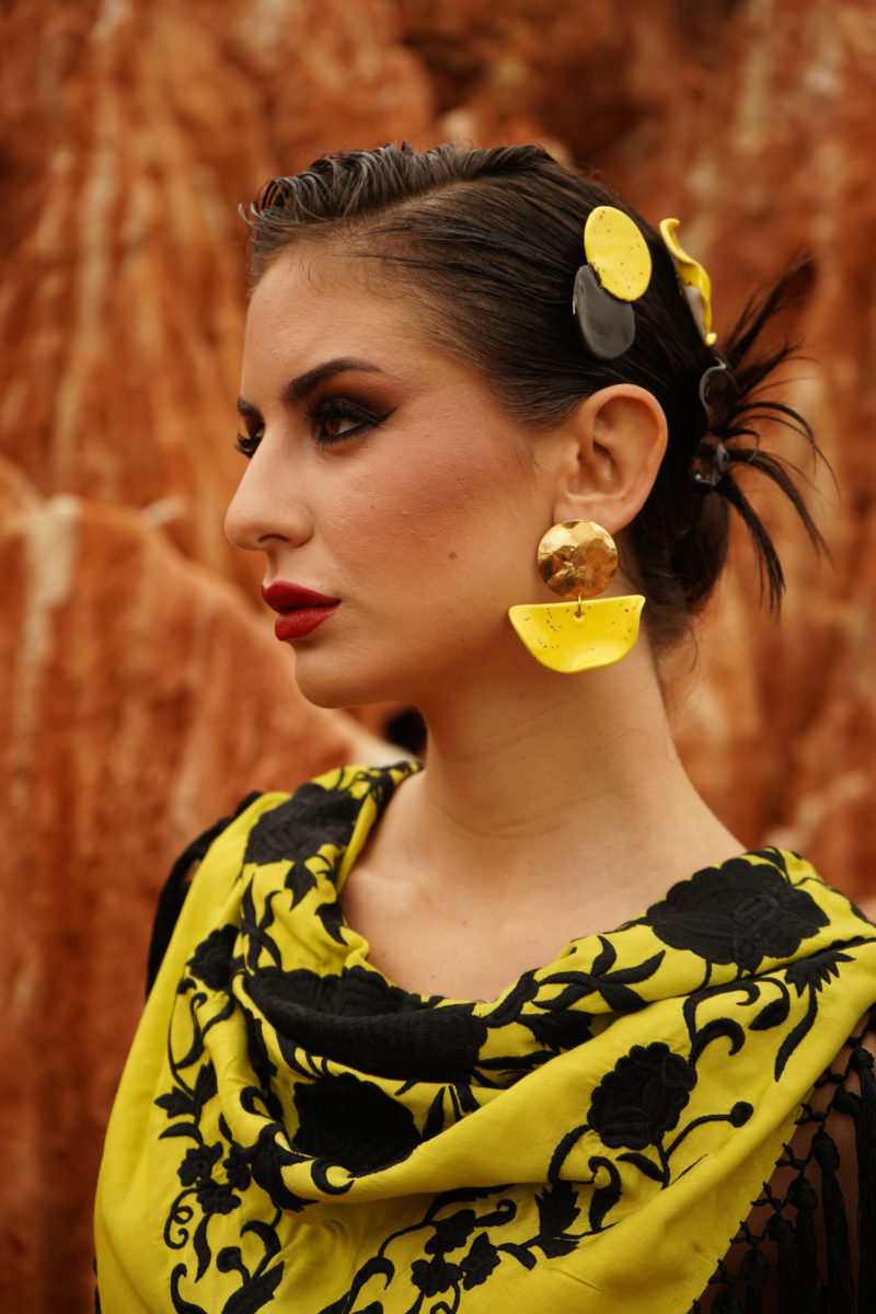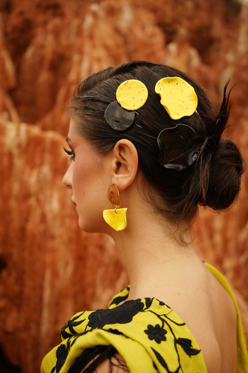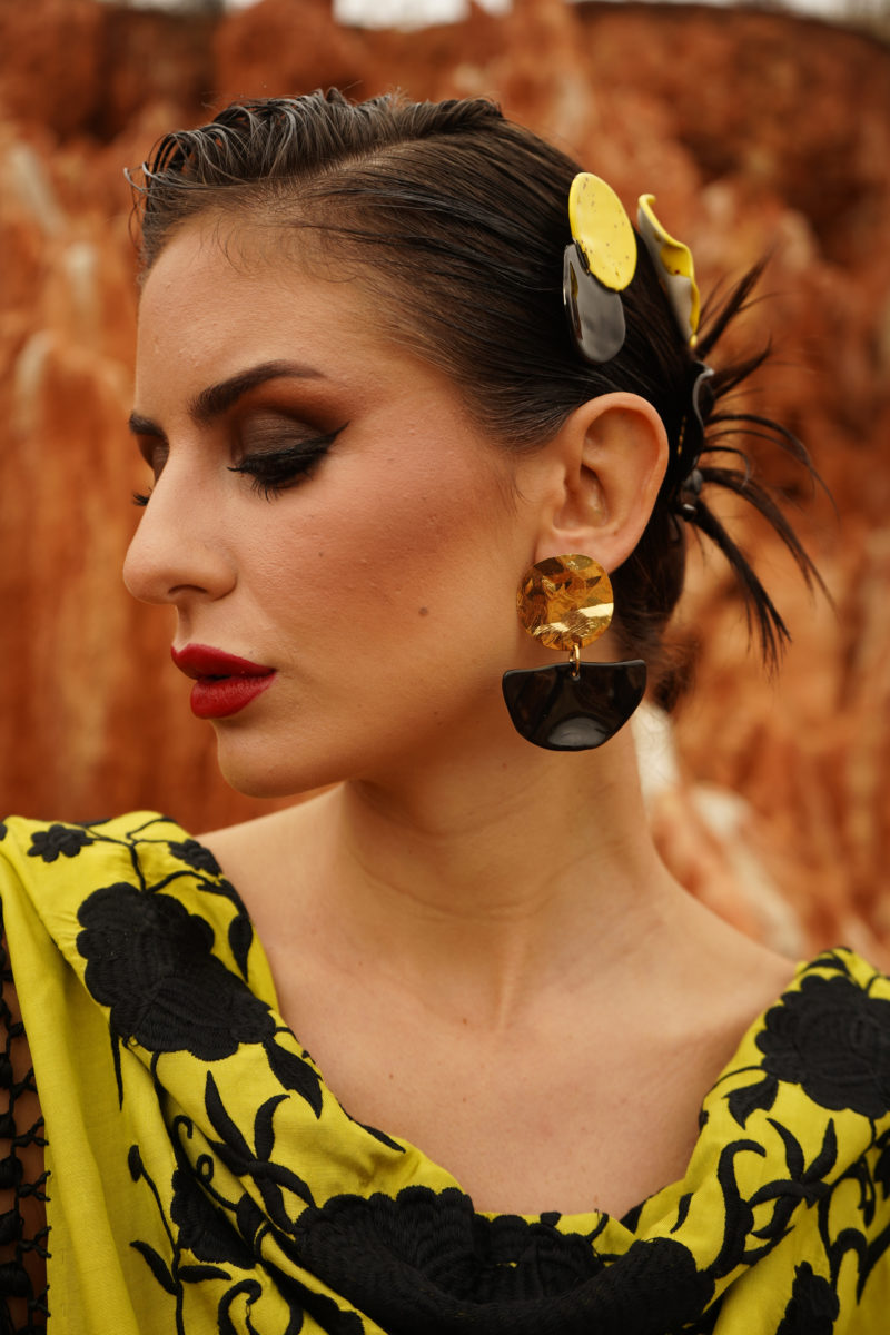 Pendiente con forma de media luna de cerámica esmaltada en alto brillo. Disponible en varios colores. Botón de metal hipoalergénico con detalles de relieve en oro brillo.