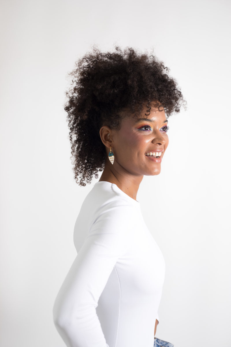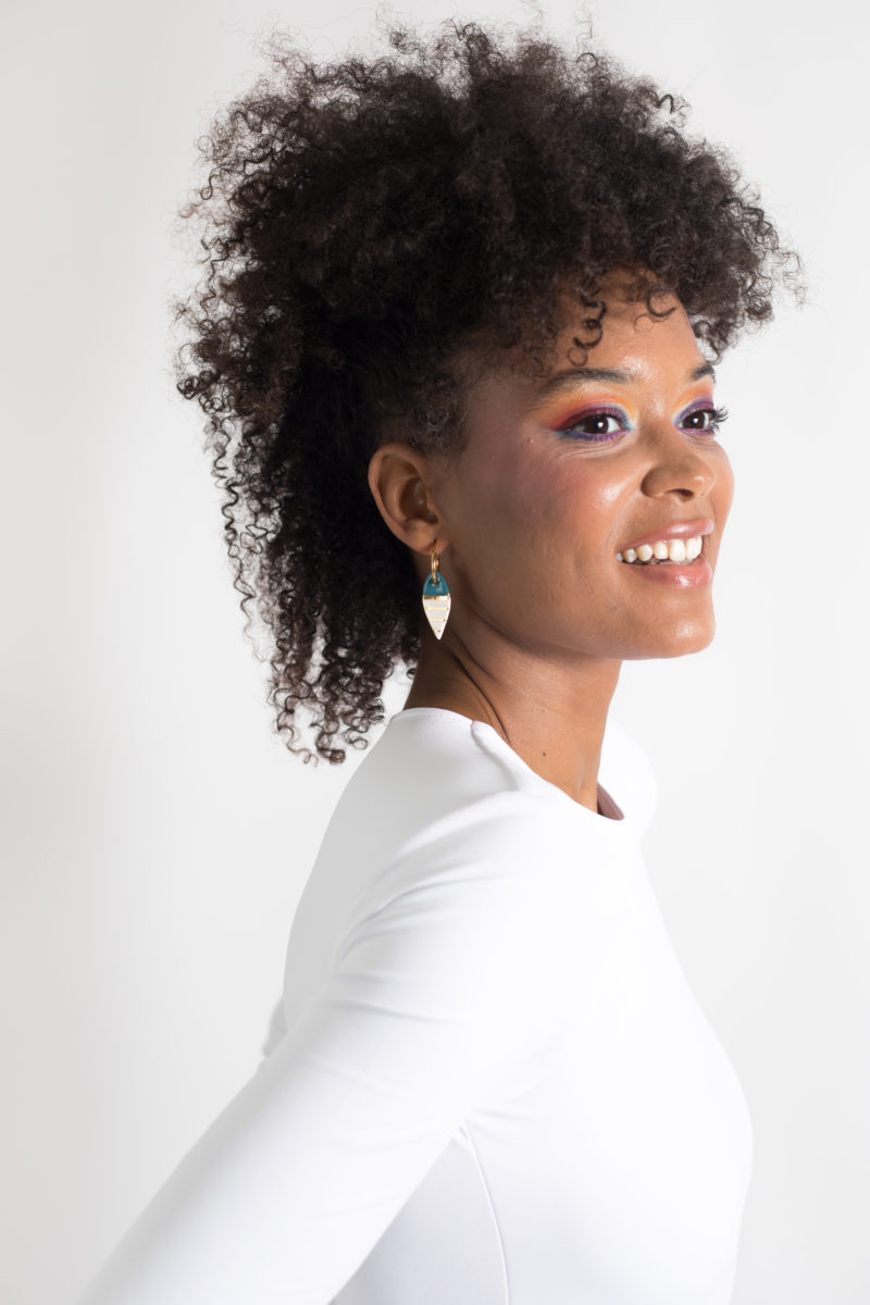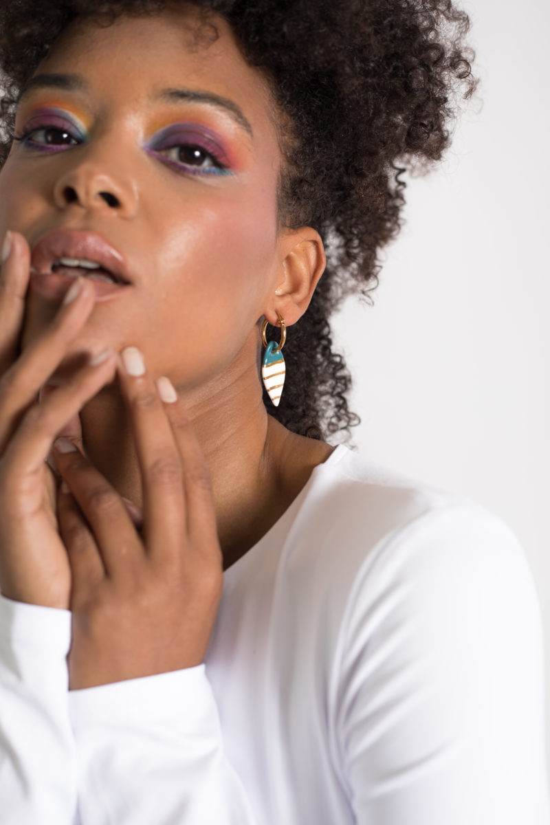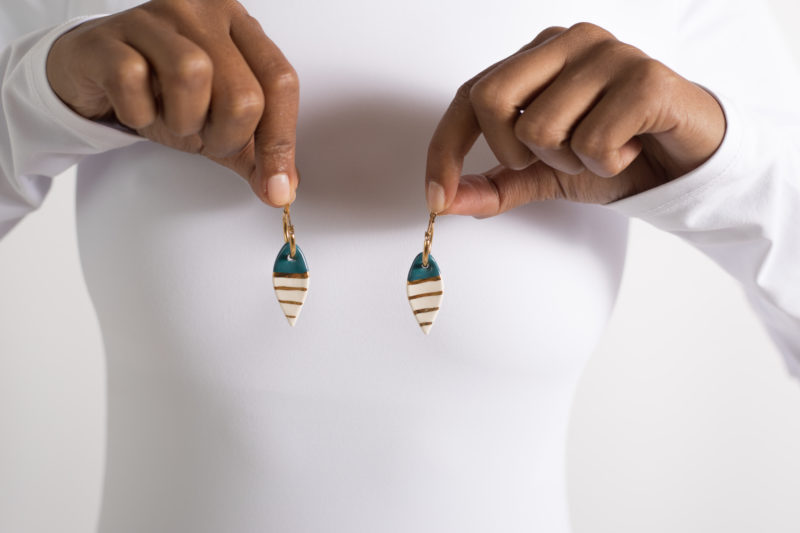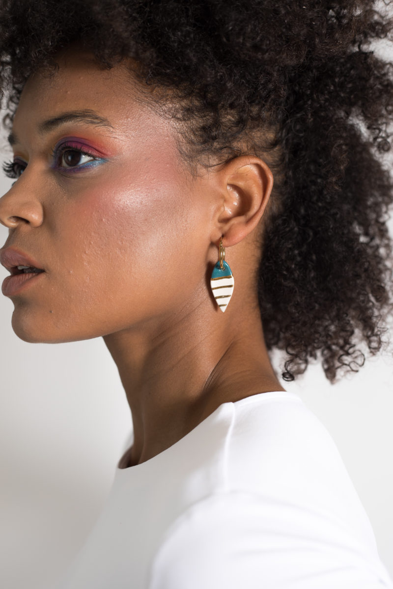 Aro de acero quirúrgico con baño de oro de 18k. Pez de cerámica esmaltada y decorada con lustre de oro de 24k. Color: azul petróleo, blanco y oro