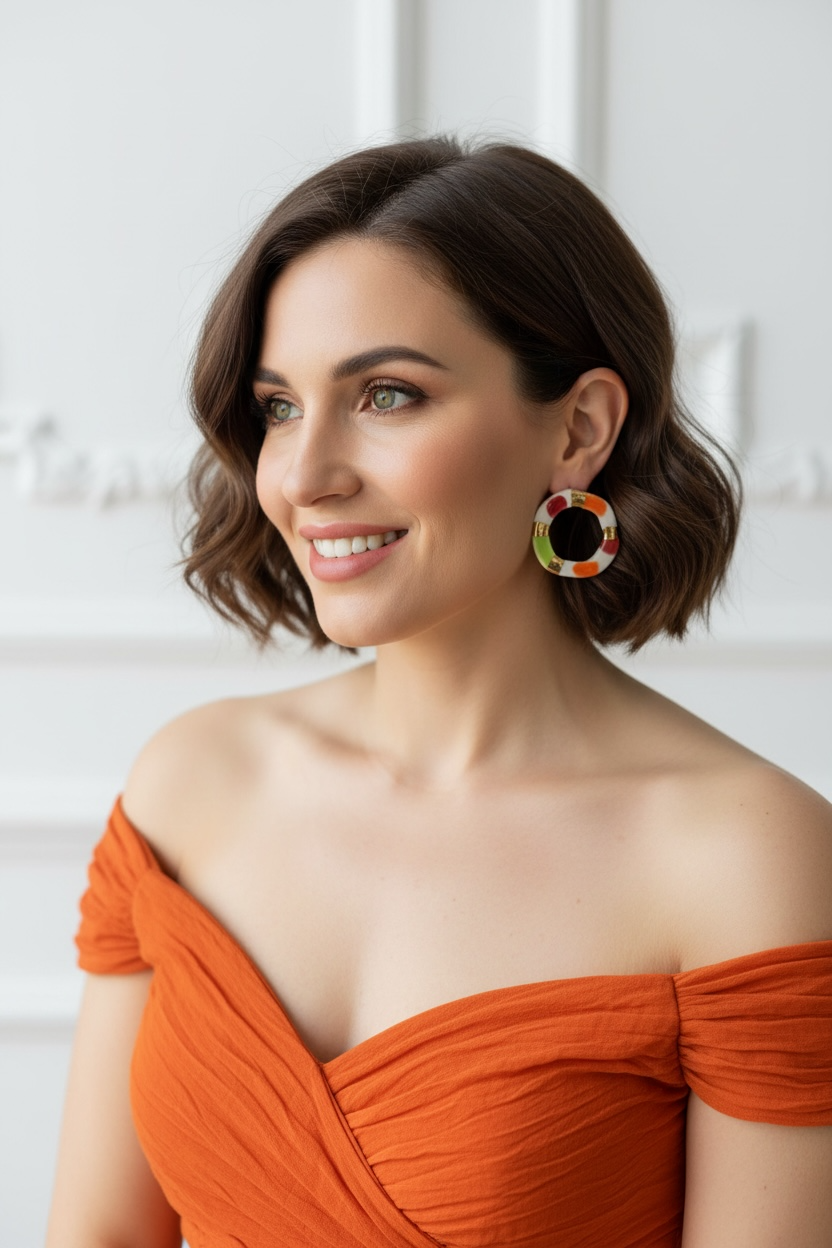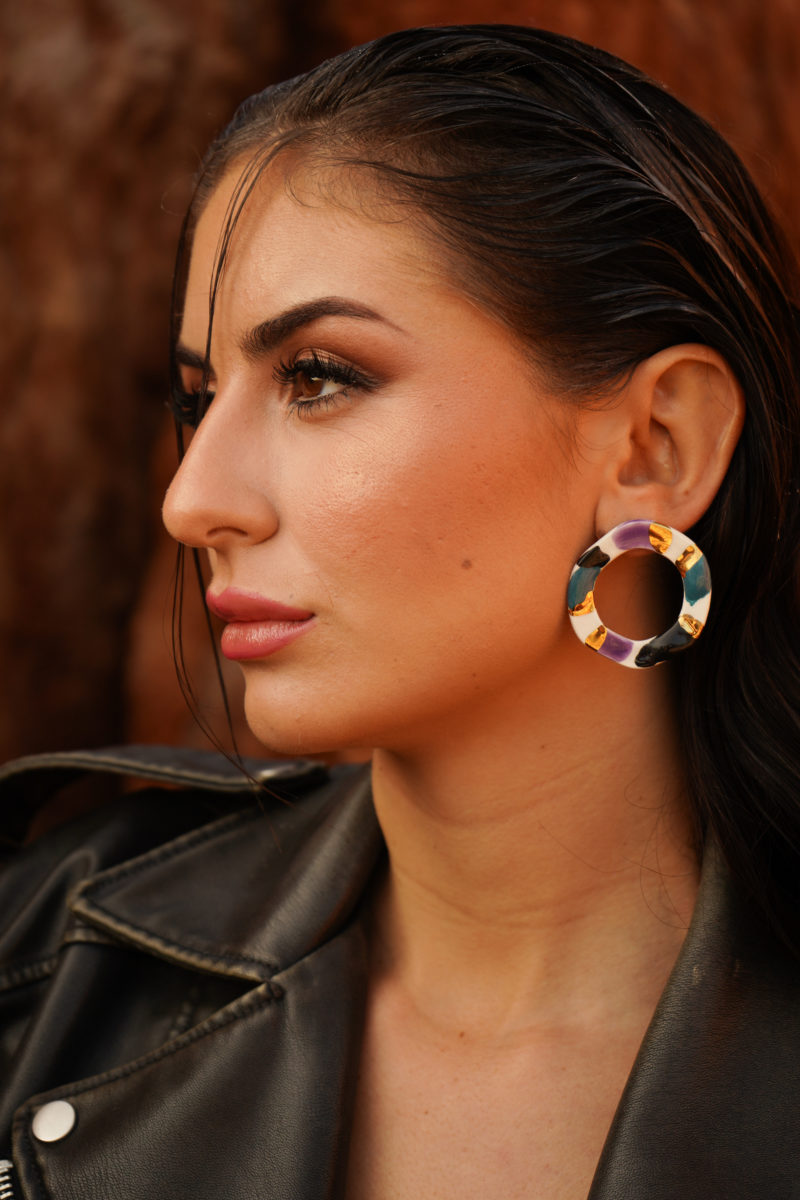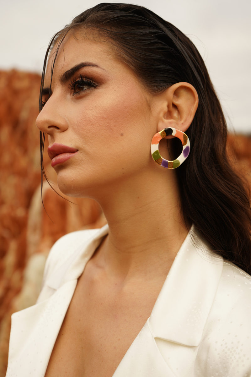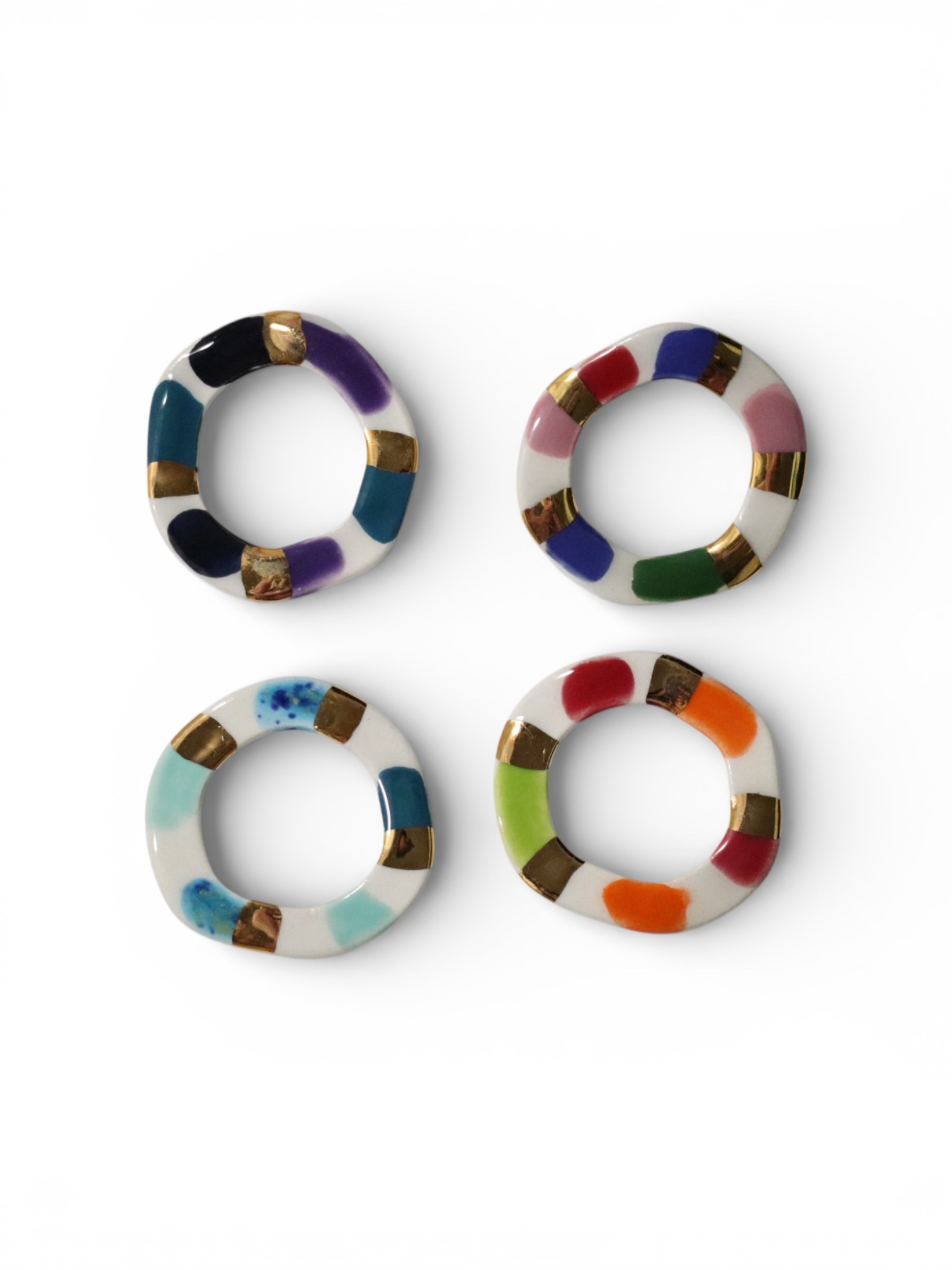 Cerámica pintada a mano y esmaltada en alto brillo con detalles en oro de 24k. Botón de acero inoxidable con baño de oro de 18k. Gina diámetro aproximado 4cm. Gina MAXI diametro aproximado 7,5cm.