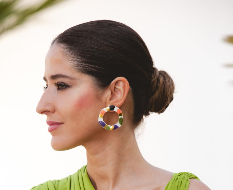 Cerámica pintada a mano y esmaltada en alto brillo con detalles en oro de 24k. Botón de acero inoxidable con baño de oro de 18k. Diametro aproximado 4cm.