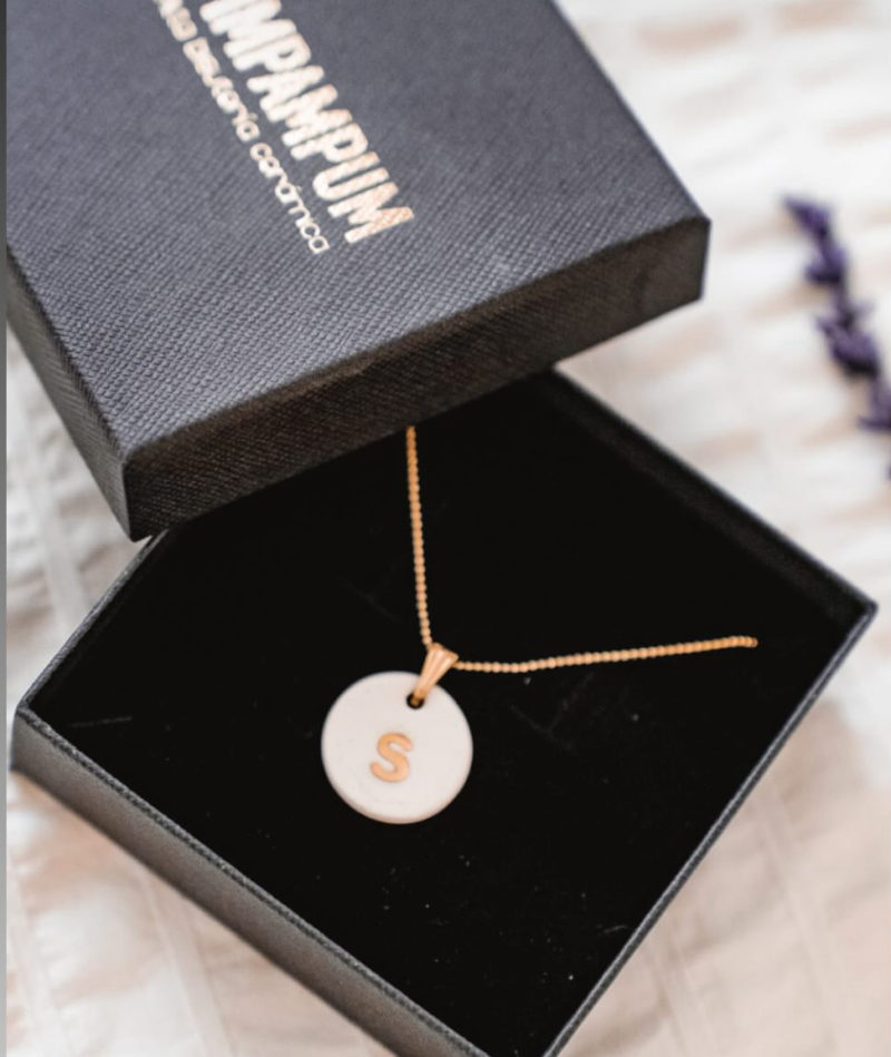 Medalla con inicial grabada en cerámica blanca esmaltada. La letra está pintada en lustre de oro de 24k.