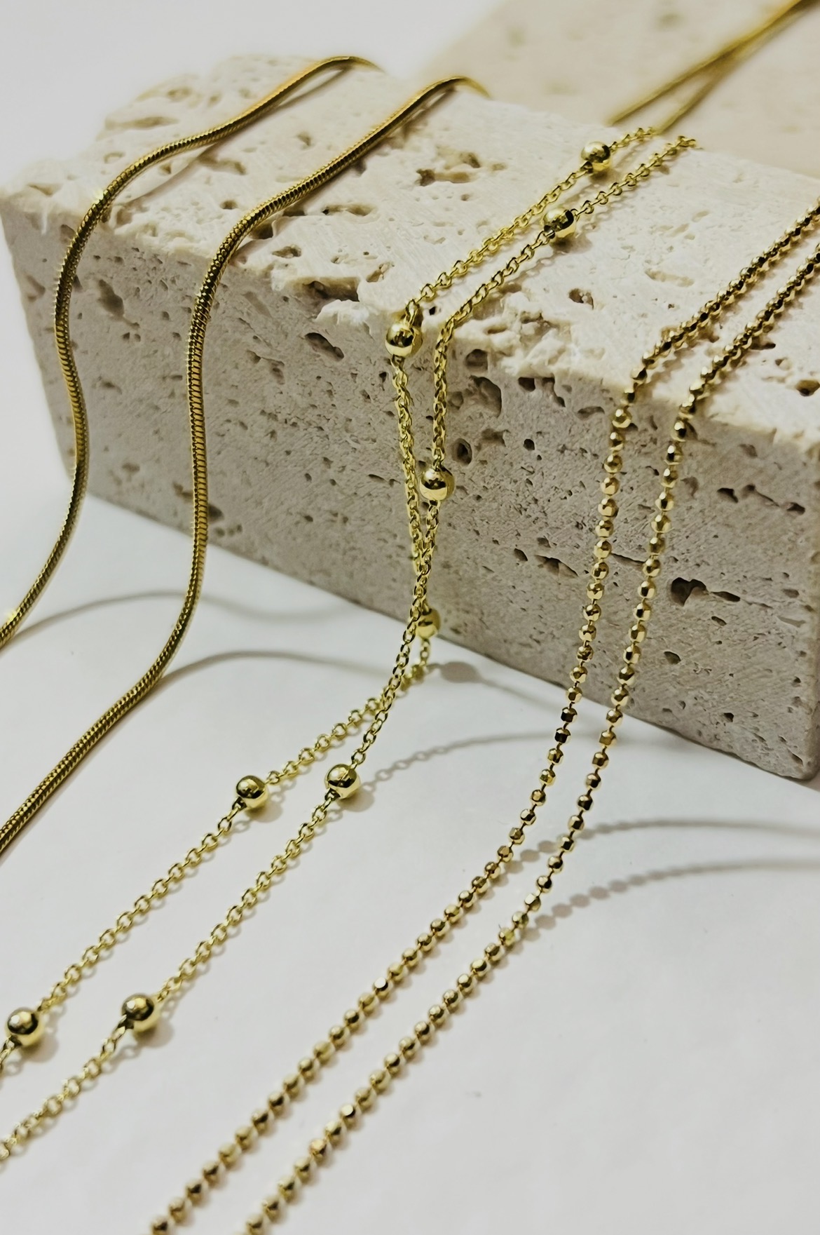 A elegir 3 modelos de cadena: Cadena bolitas corte de diamante, plata con baño de oro de 18k (derecha de la imagen) Cadena de bolas, plata con baño de oro de 18k (centro) Cadena cola de ratón acero inoxidable con baño de oro de 18k (izquierda de la imagen)